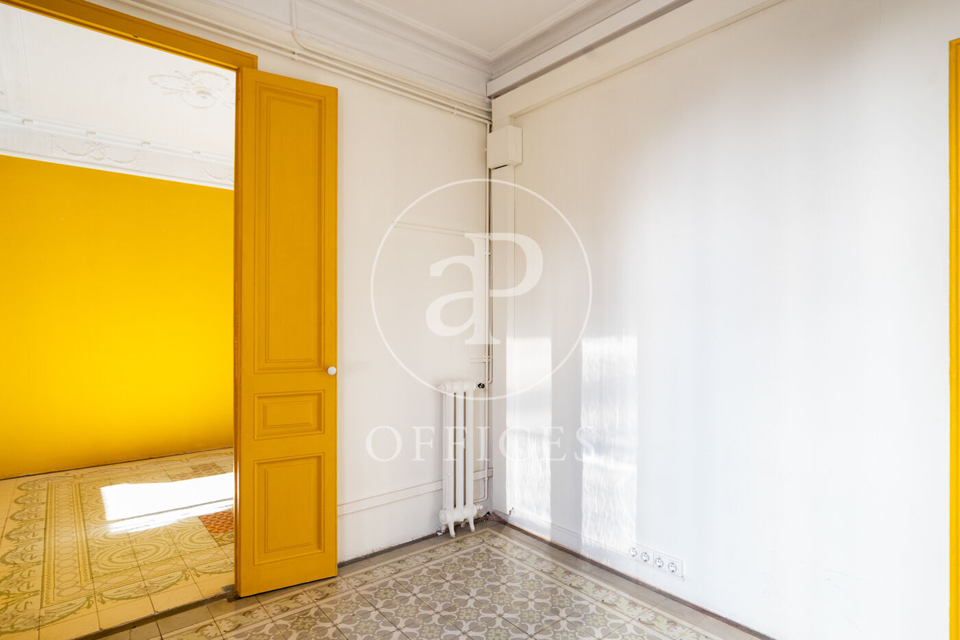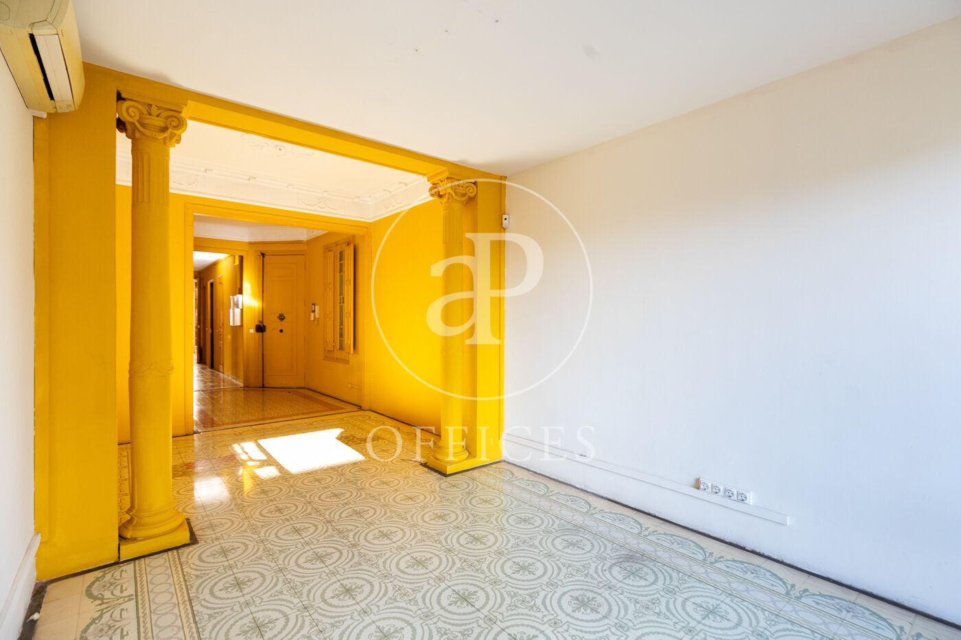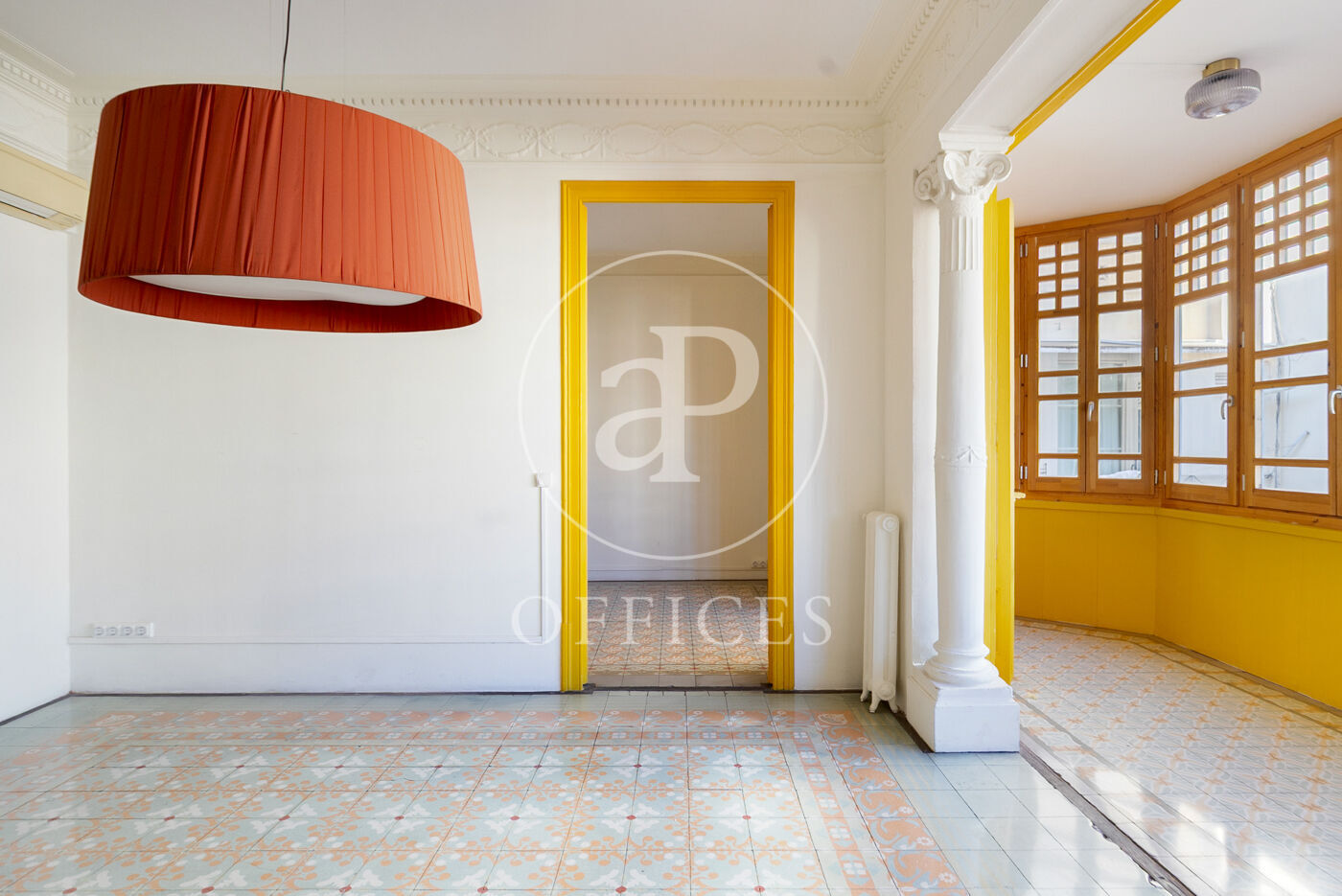 La oficina con 156m2 construidos, mantiene el encanto original del edificio, conservando detalles arquitectónicos como altos techos con molduras, suelos de mosaico hidráulico y otros elementos representativos de la arquitectura modernista.
