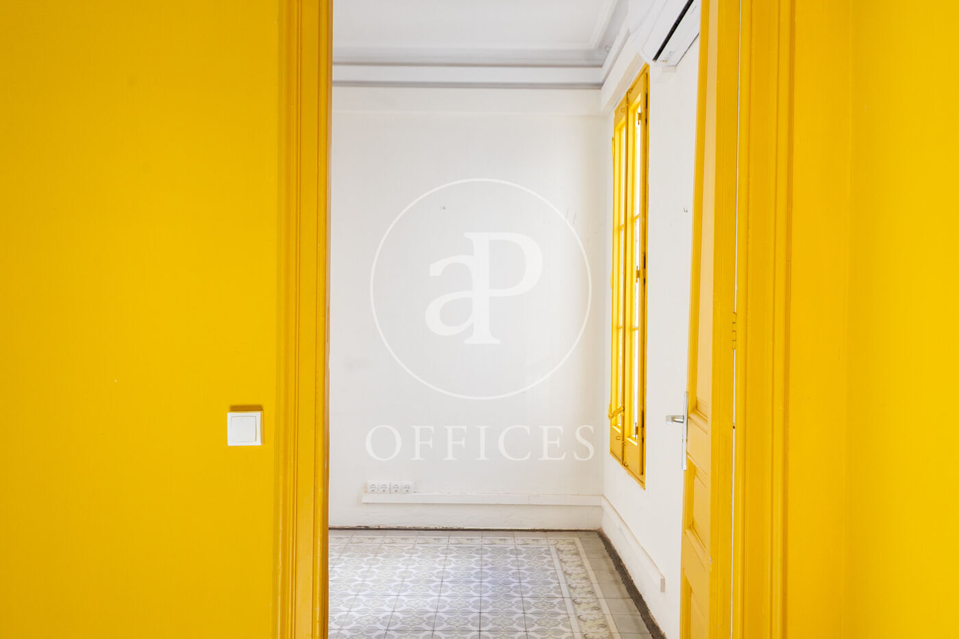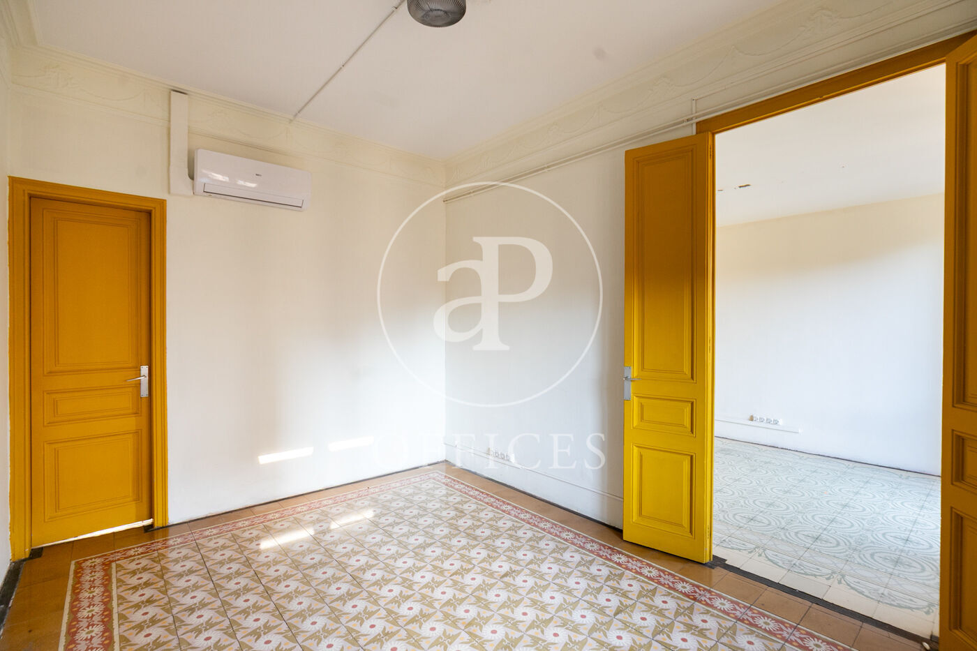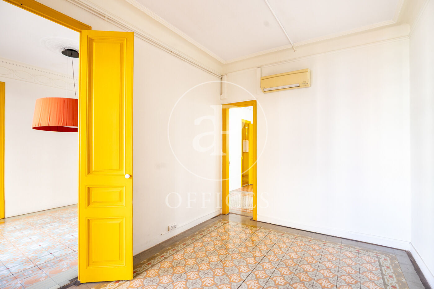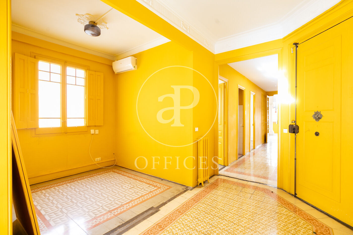 La oficina con 156m2 construidos, mantiene el encanto original del edificio, conservando detalles arquitectónicos como altos techos con molduras, suelos de mosaico hidráulico y otros elementos representativos de la arquitectura modernista.