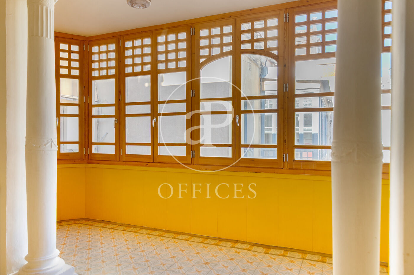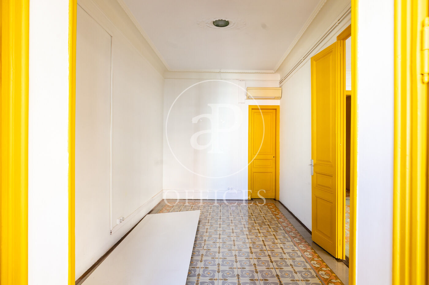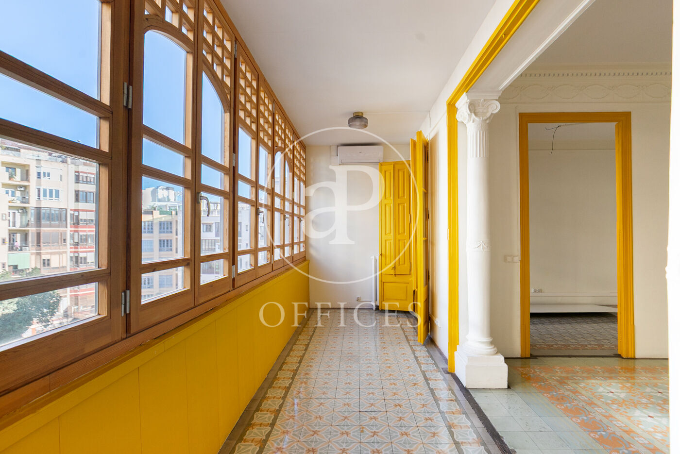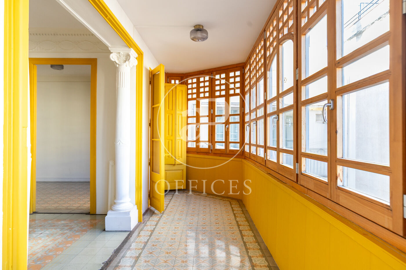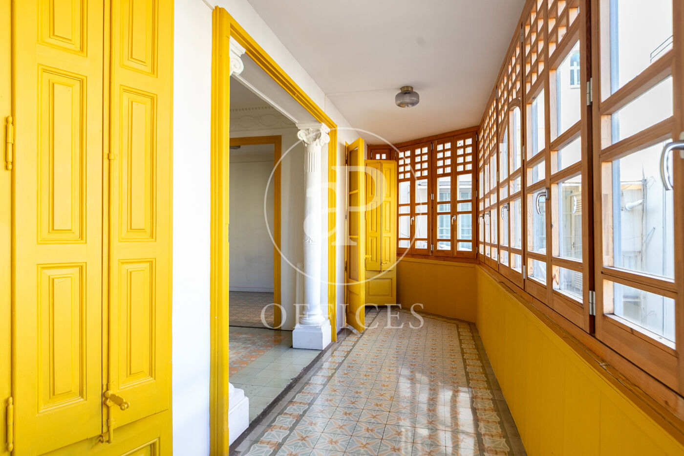 Con una superficie construida de 156 m², la oficina conserva el encanto original del edificio, destacando elementos propios de la arquitectura modernista como techos altos con molduras, suelos de mosaico hidráulico y otros detalles arquitectónicos de carácter singular.