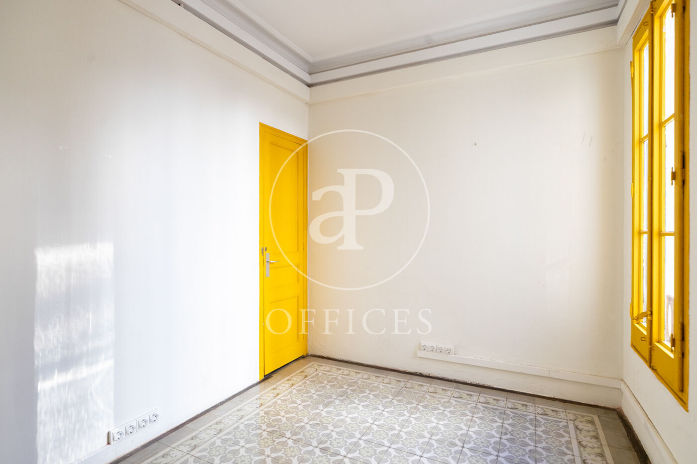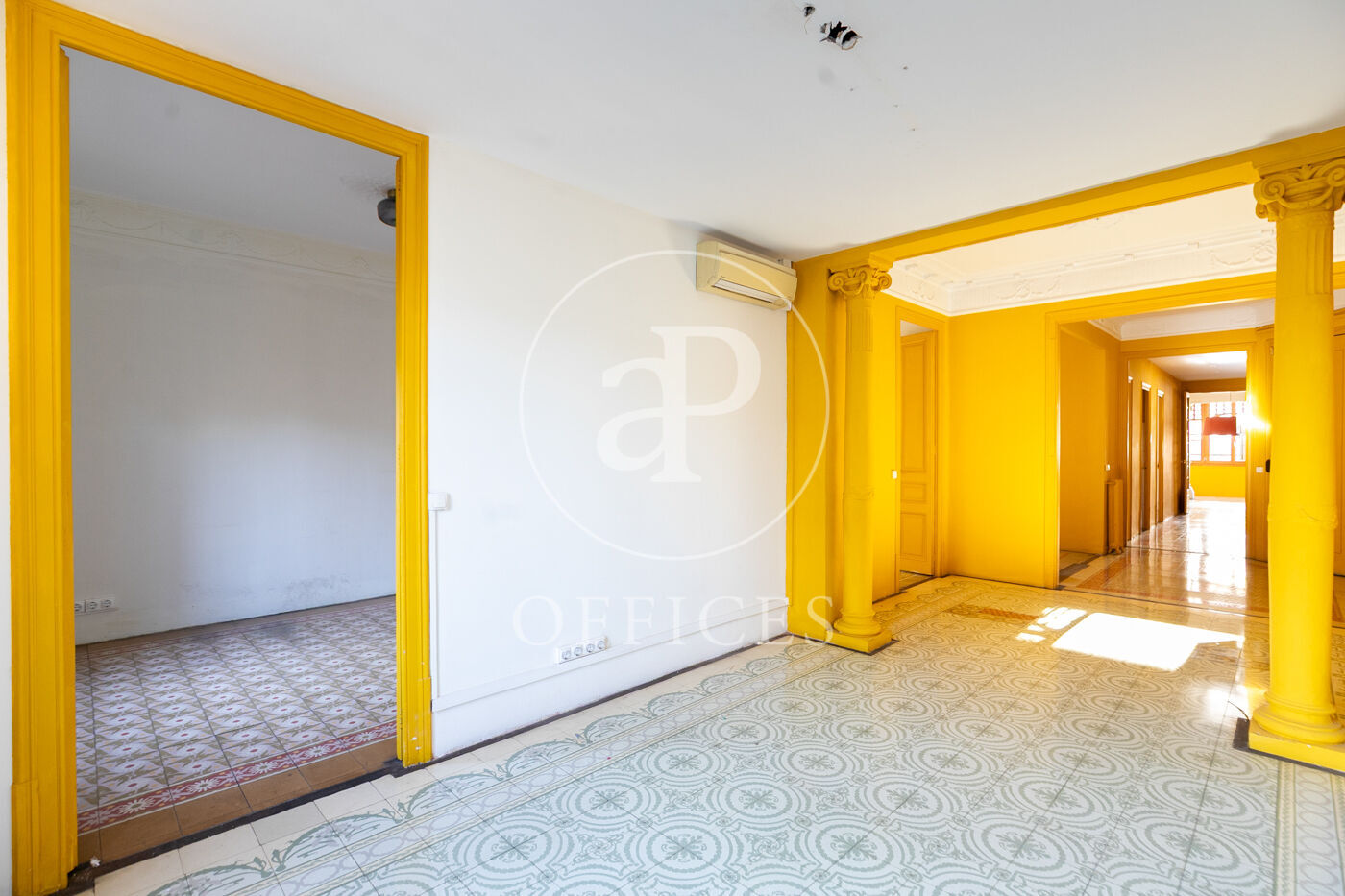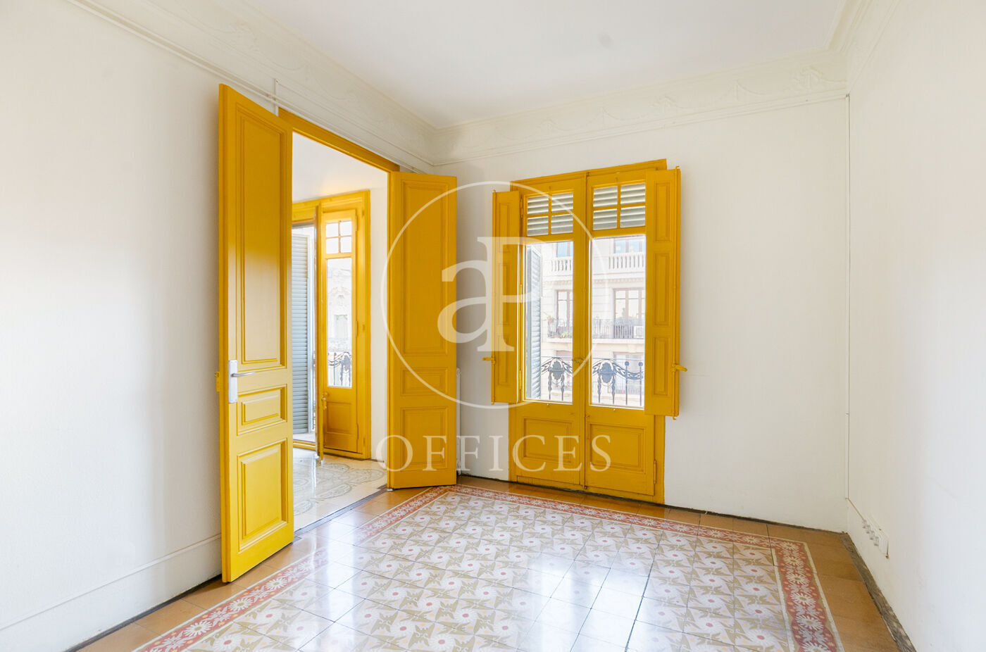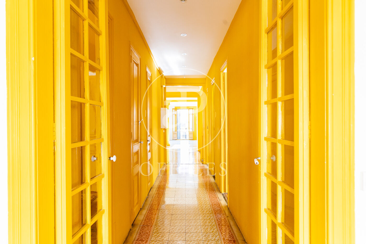 Con una superficie construida de 156 m², la oficina conserva el encanto original del edificio, destacando elementos propios de la arquitectura modernista como techos altos con molduras, suelos de mosaico hidráulico y otros detalles arquitectónicos de carácter singular.