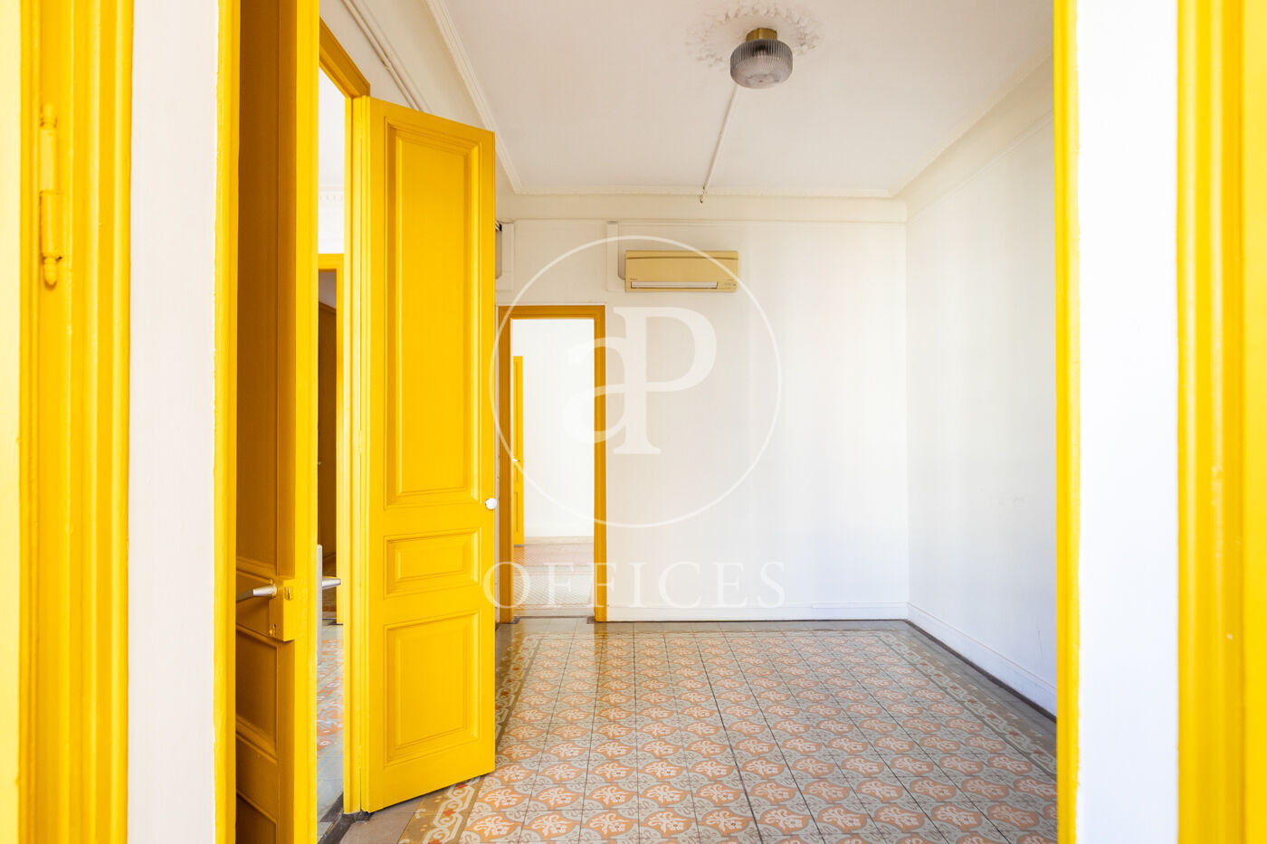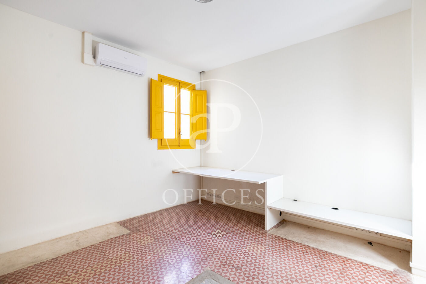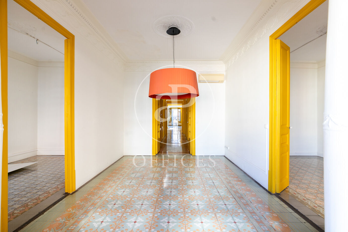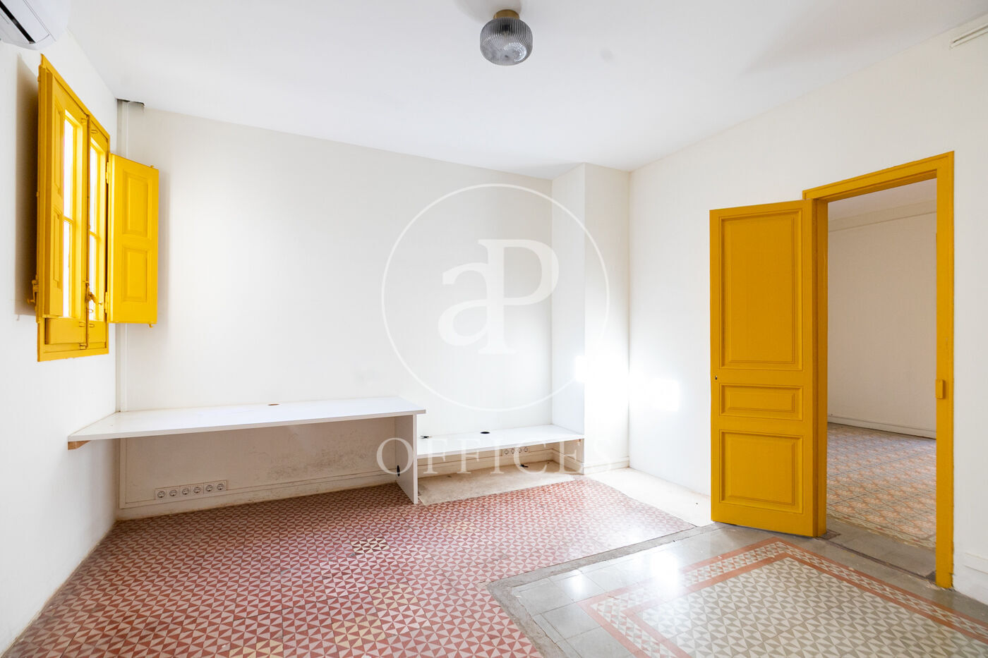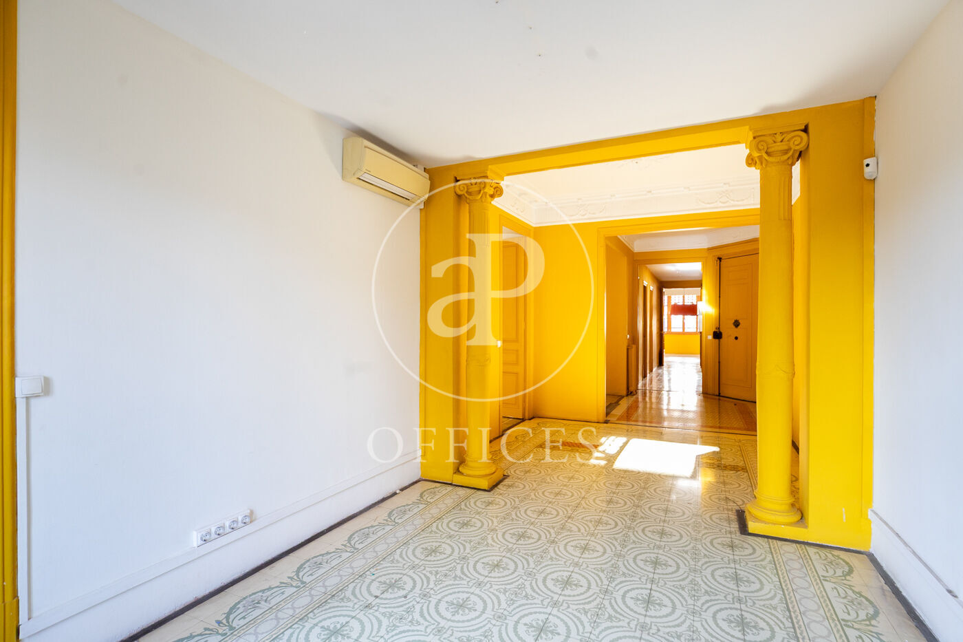 Con una superficie construida de 156 m², la oficina conserva el encanto original del edificio, destacando elementos propios de la arquitectura modernista como techos altos con molduras, suelos de mosaico hidráulico y otros detalles arquitectónicos de carácter singular.