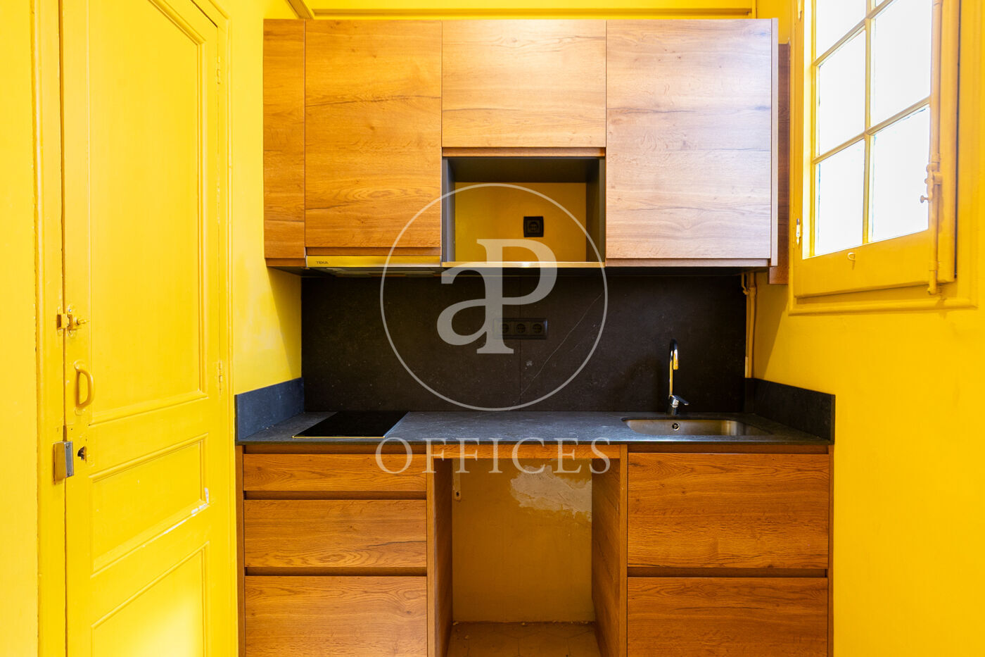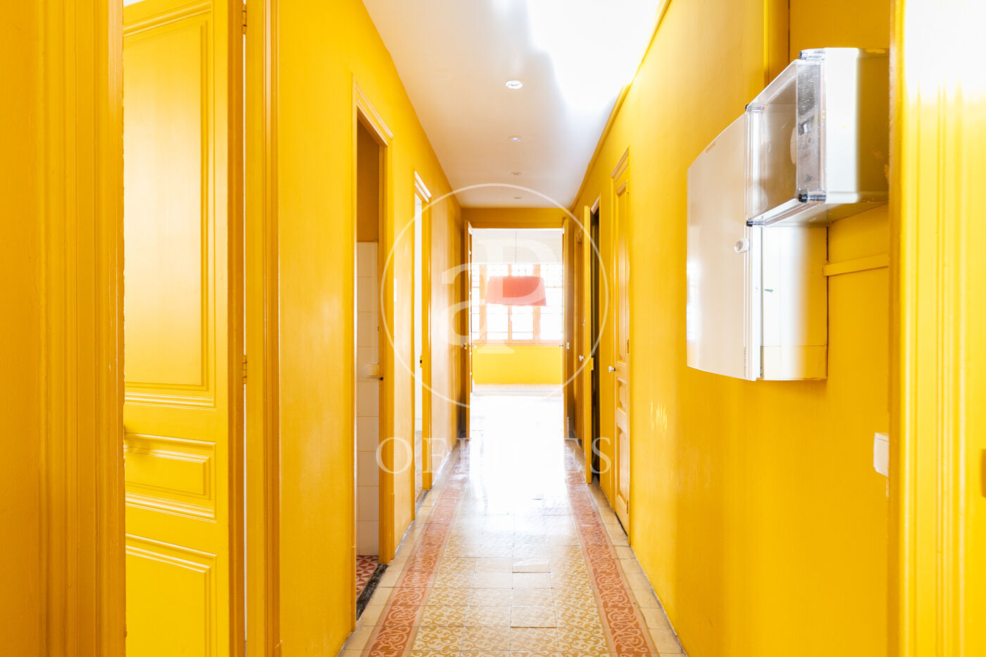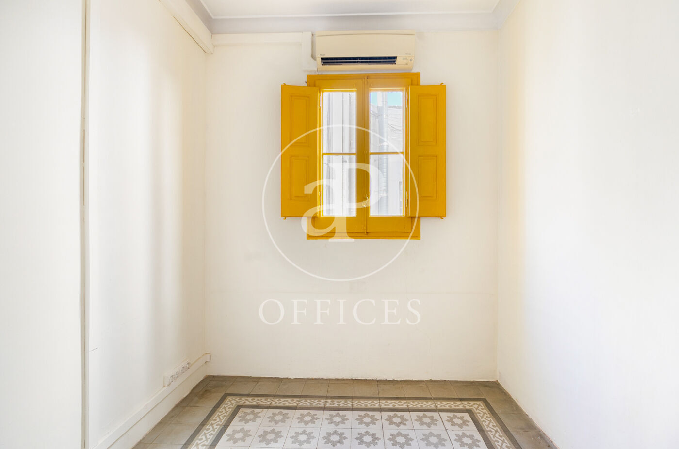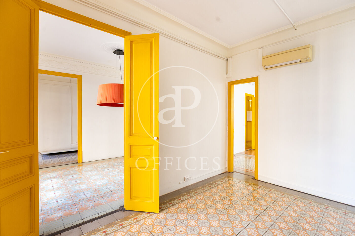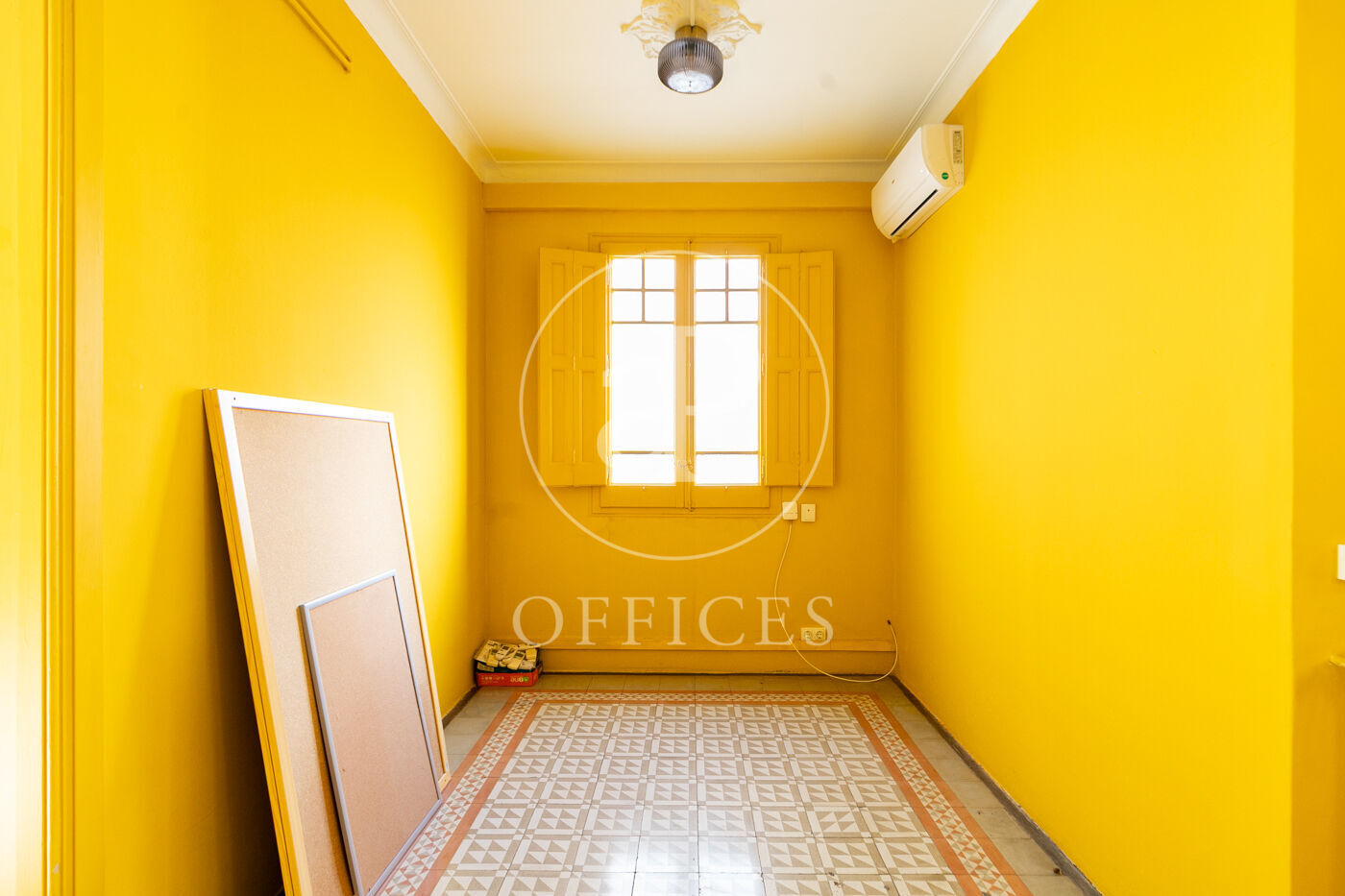 Con una superficie construida de 156 m², la oficina conserva el encanto original del edificio, destacando elementos propios de la arquitectura modernista como techos altos con molduras, suelos de mosaico hidráulico y otros detalles arquitectónicos de carácter singular.