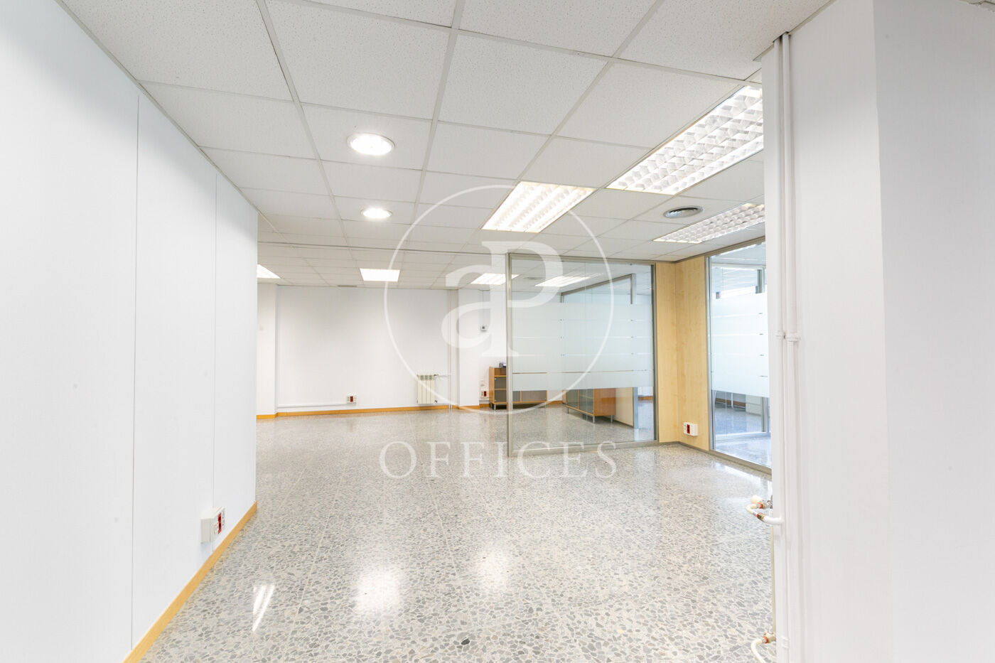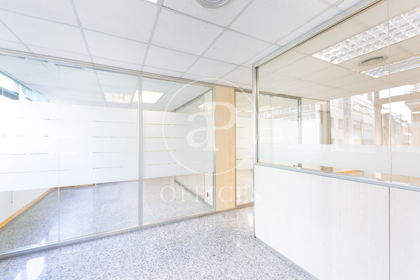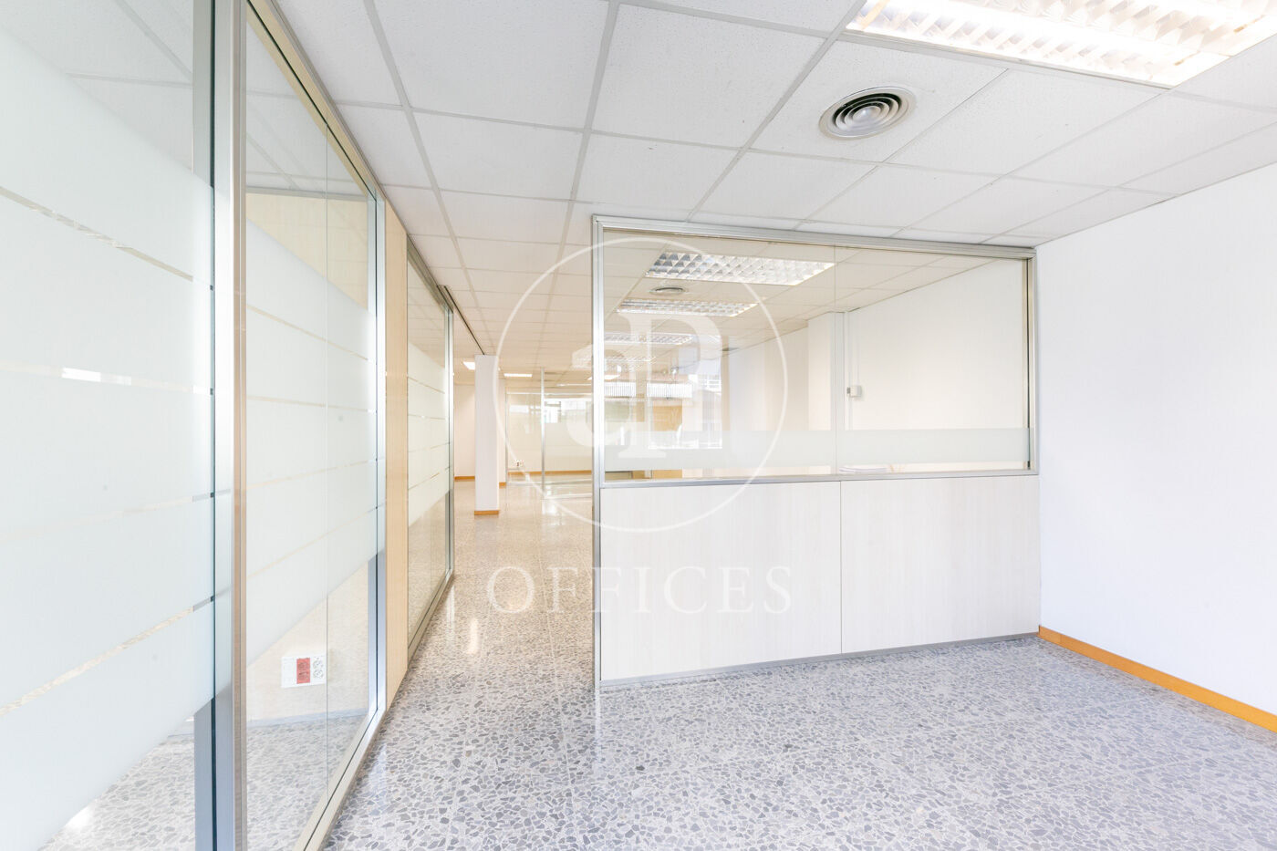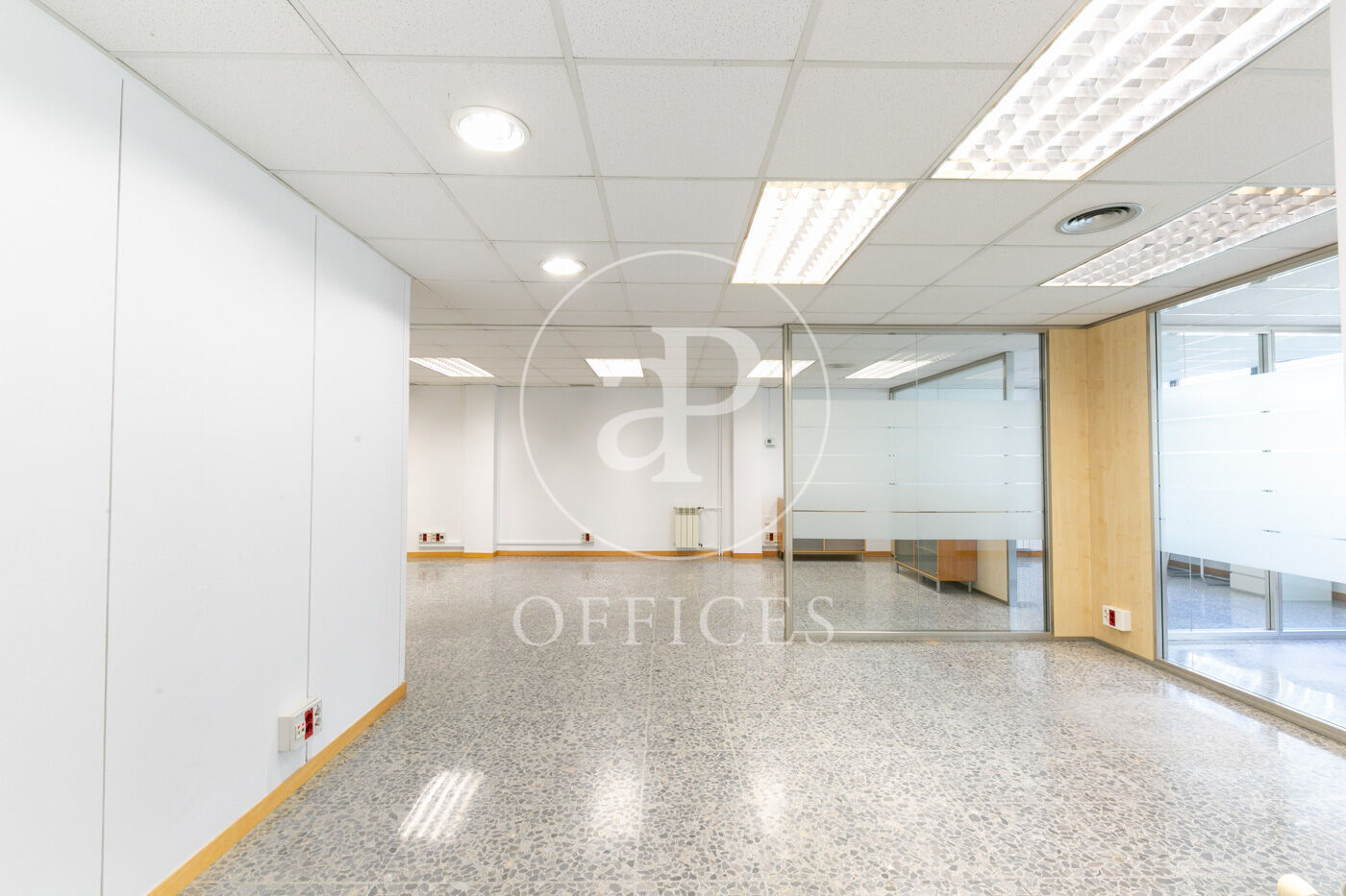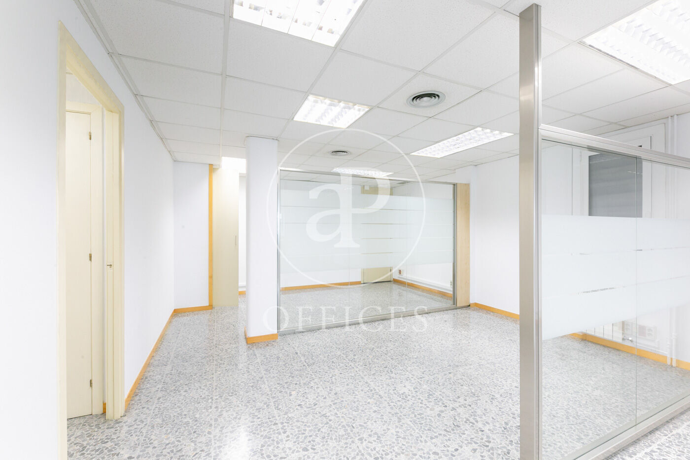 L’espai, amb una superfície de 170 m² i orientació al carrer, destaca per la seva gran lluminositat. La distribució s’organitza mitjançant mampares acristalades, amb una àrea diàfana de treball i tres despatxos. Disposa de dos lavabos, office i sala tècnica (rack).