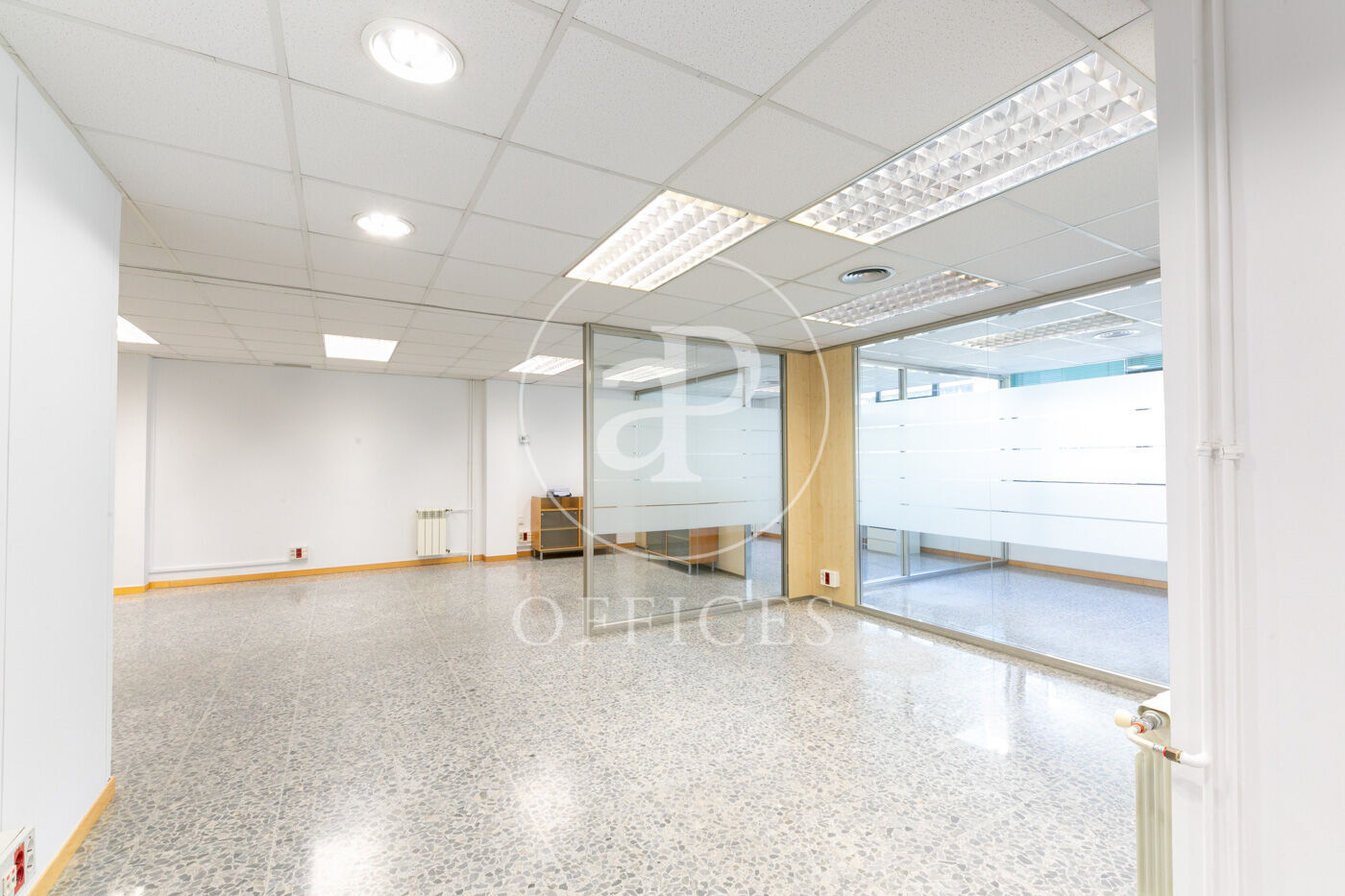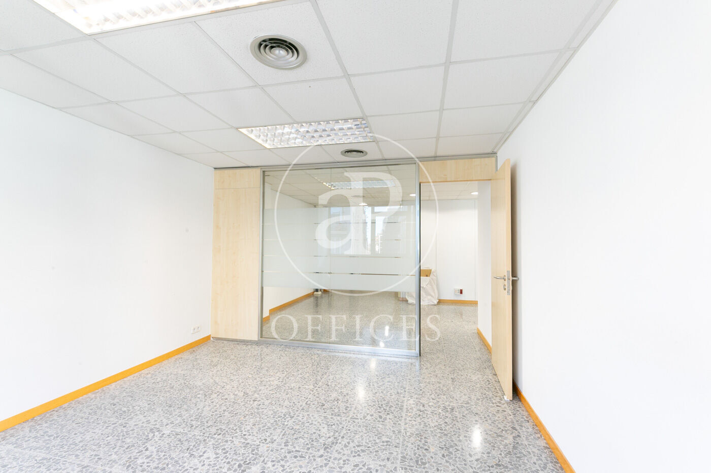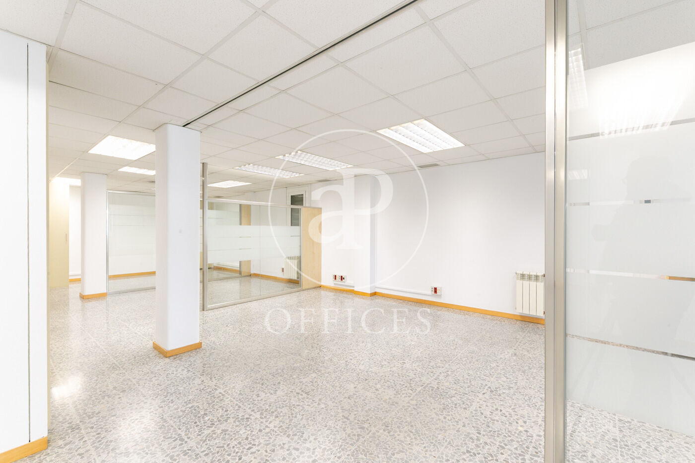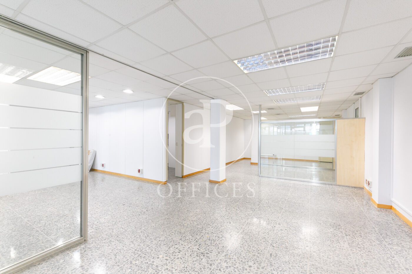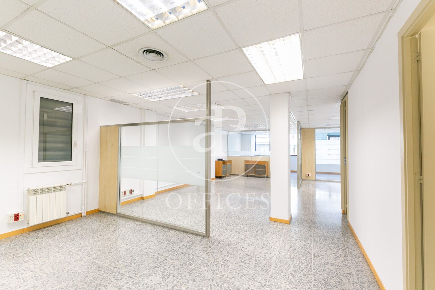 L’espai, amb una superfície de 170 m² i orientació al carrer, destaca per la seva gran lluminositat. La distribució s’organitza mitjançant mampares acristalades, amb una àrea diàfana de treball i tres despatxos. Disposa de dos lavabos, office i sala tècnica (rack).